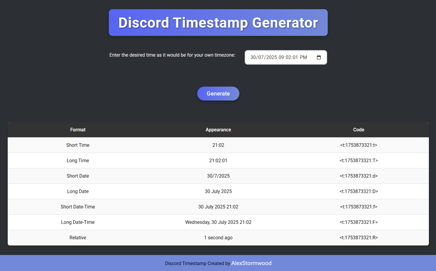 Lil demo project to show how JavaScript can be used to generate Discord timestamp snippets.